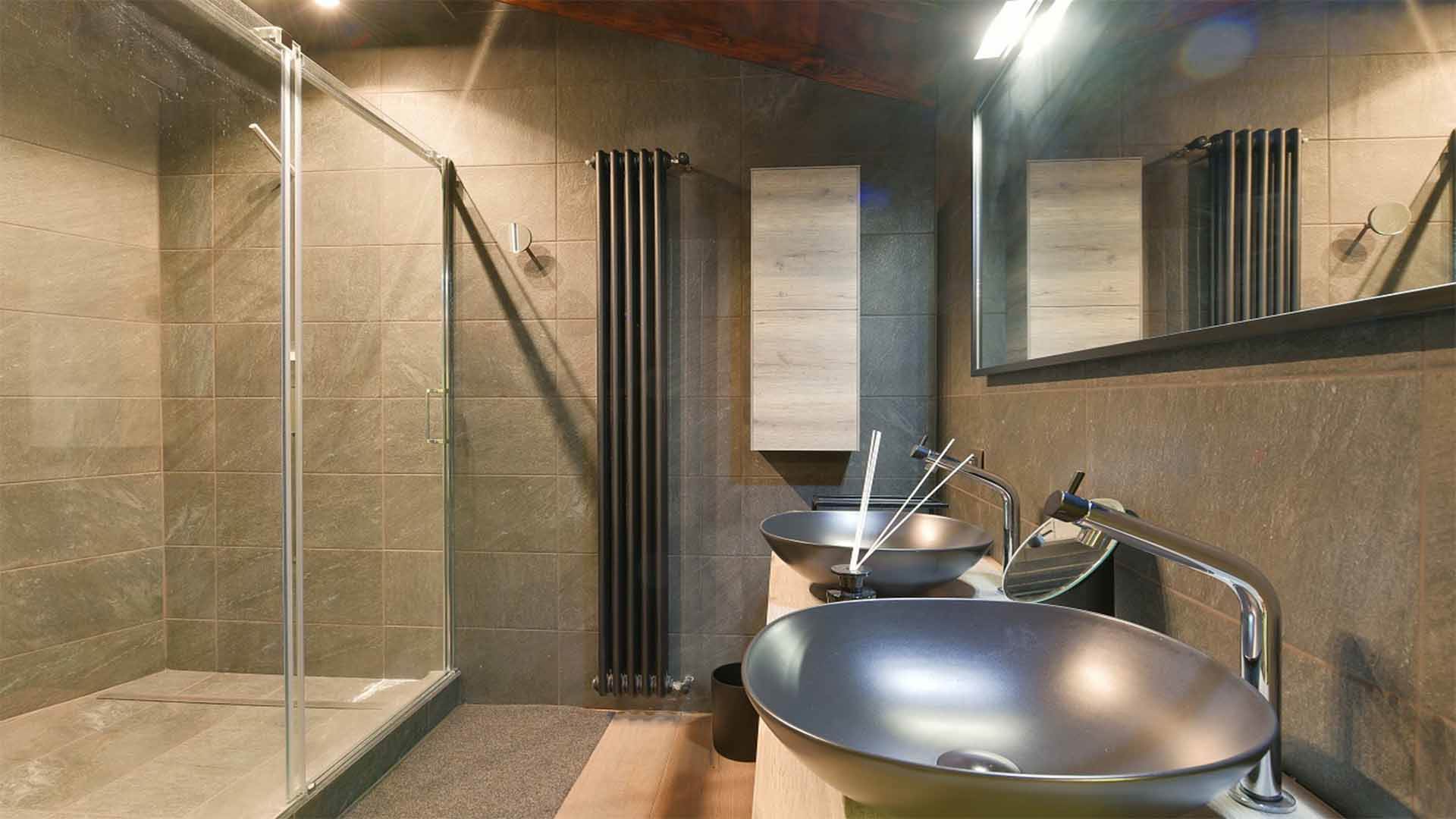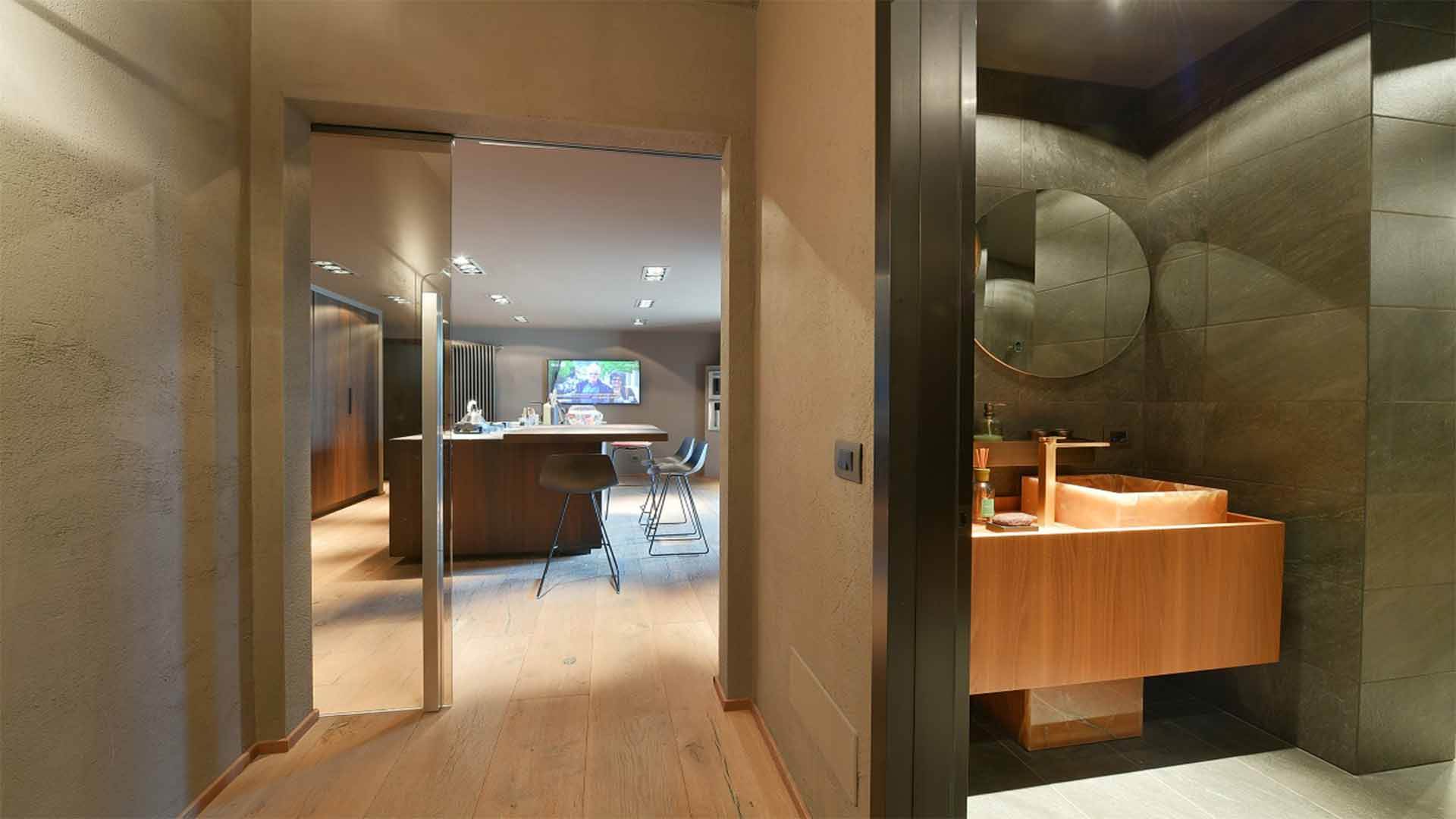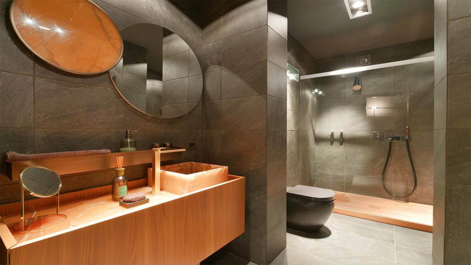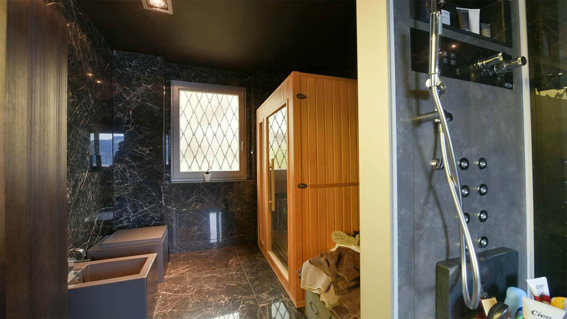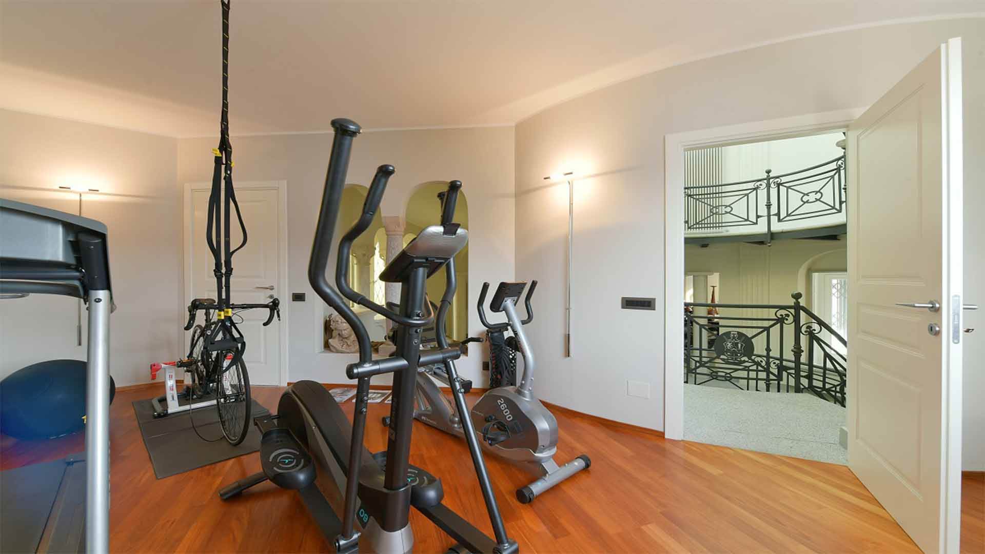 This property also includes a large fitness area with a bathroom and sauna.