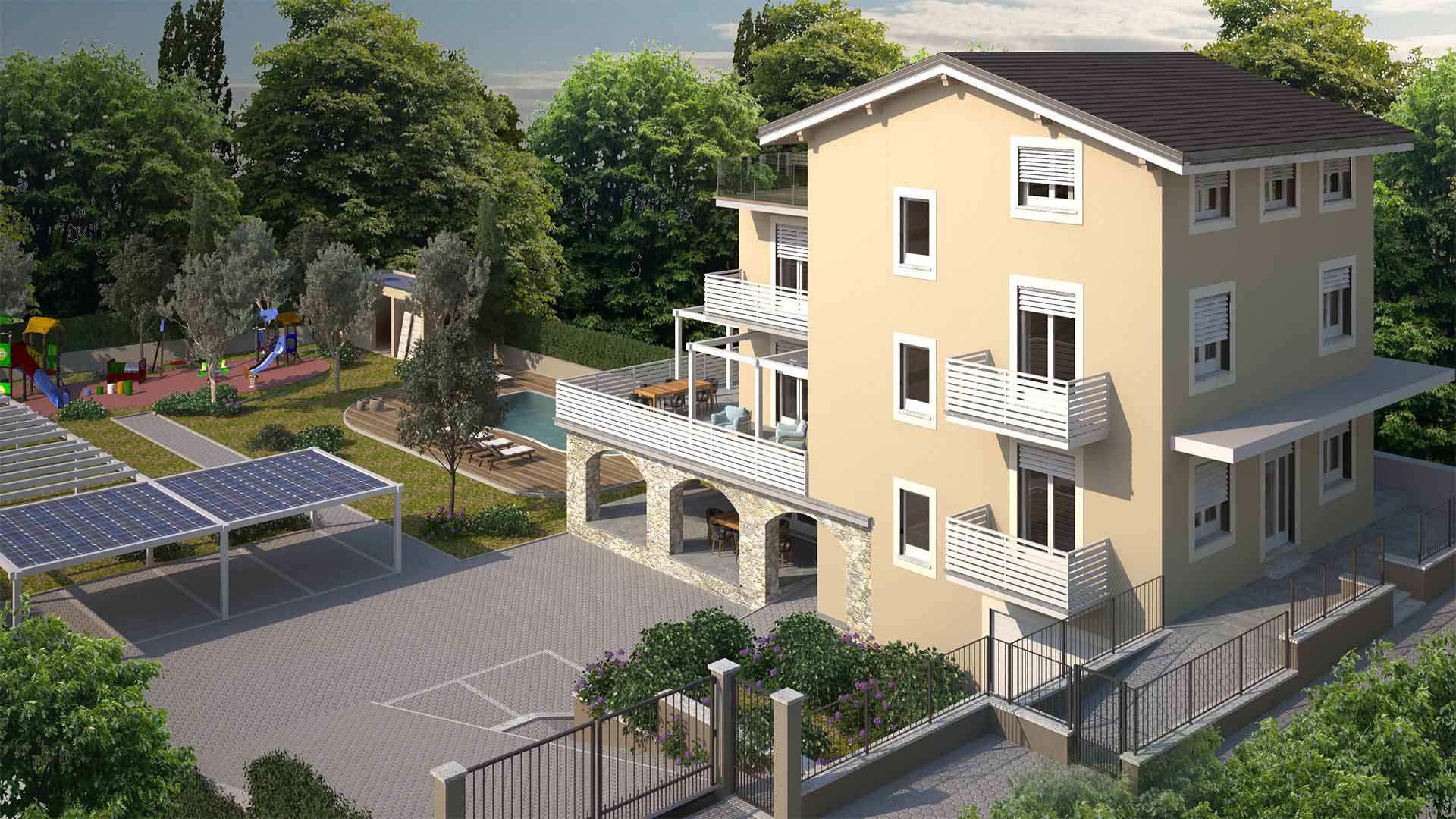Le residenze disporranno di tecnologici impianti di raffrescamento e riscaldamento, finiture interne di pregio con materiali esclusivi, a servizio degli appartamenti uno splendido giardino, una meravigliosa piscina con prendisole, parcheggi con ricariche elettriche, campo da tennis/padel, area wellness con sauna, bagno turco e palestra attrezzata.