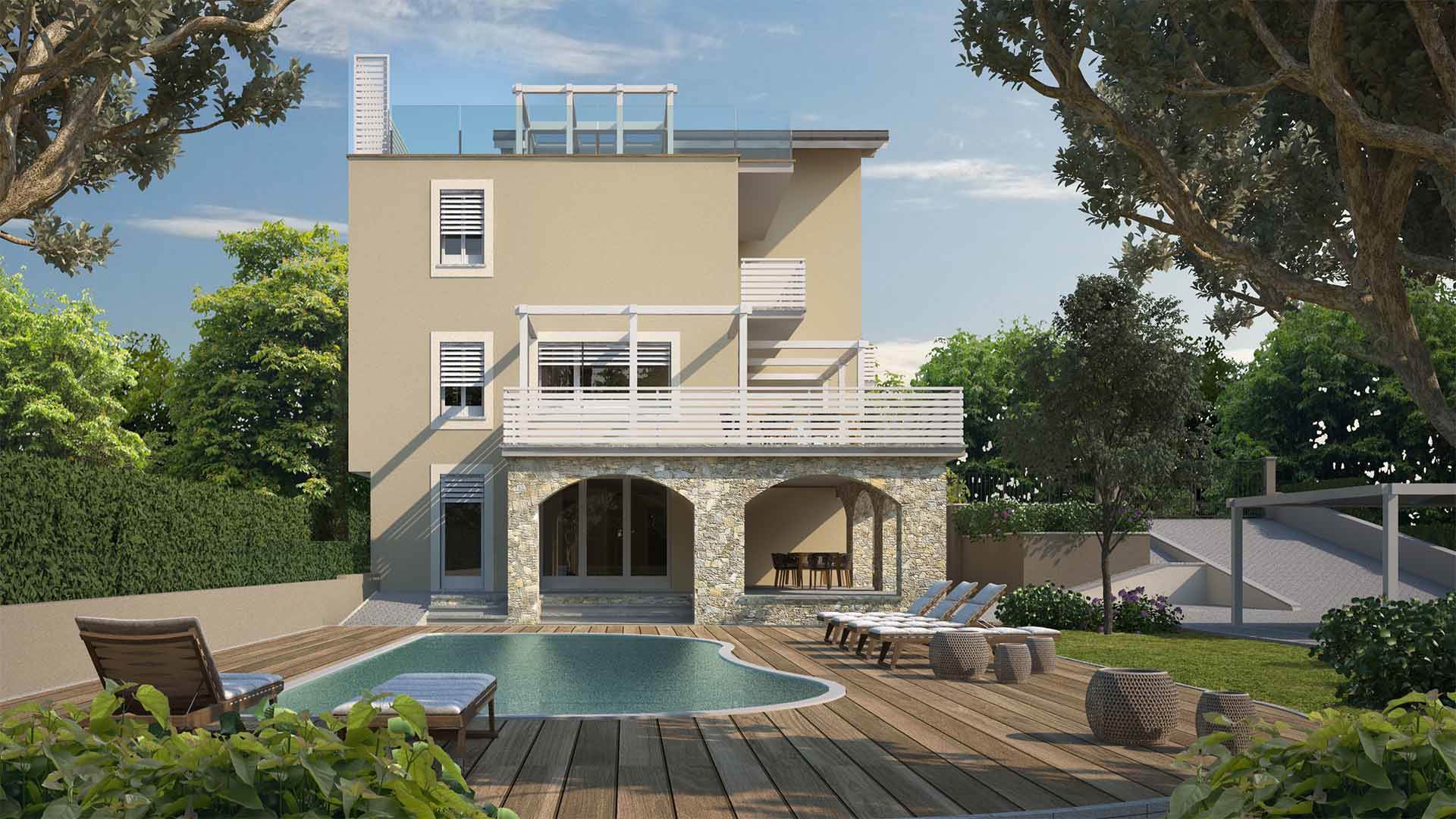 La villa totalmente indipendente dispone di un ampio giardino e piscina ed è suddivisa su tre livelli.