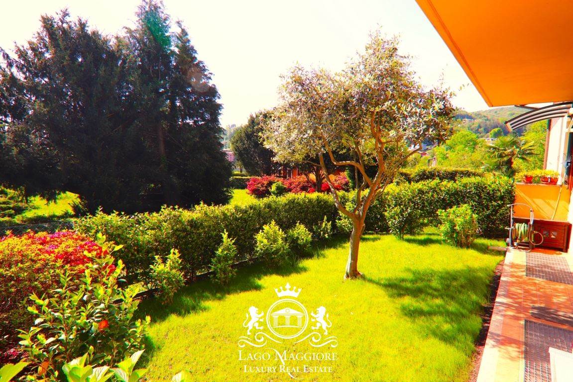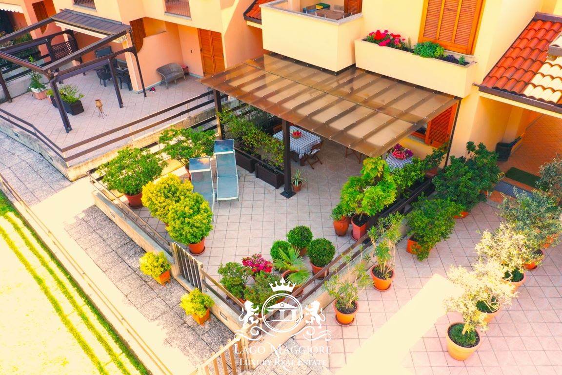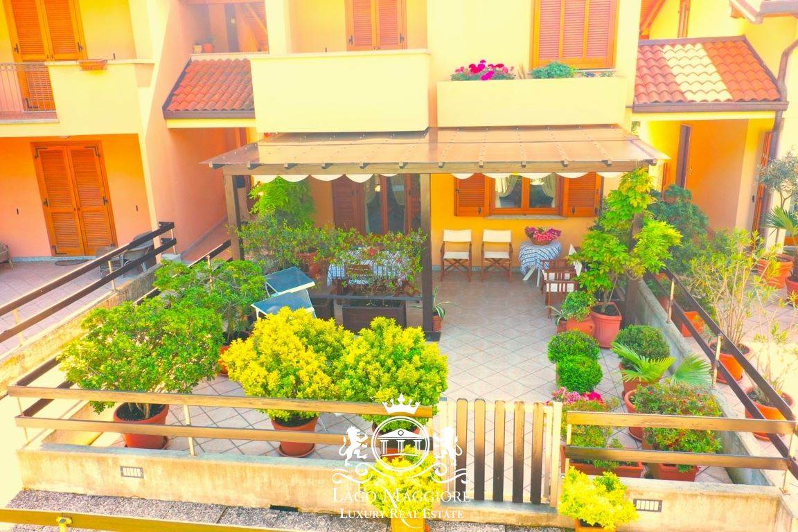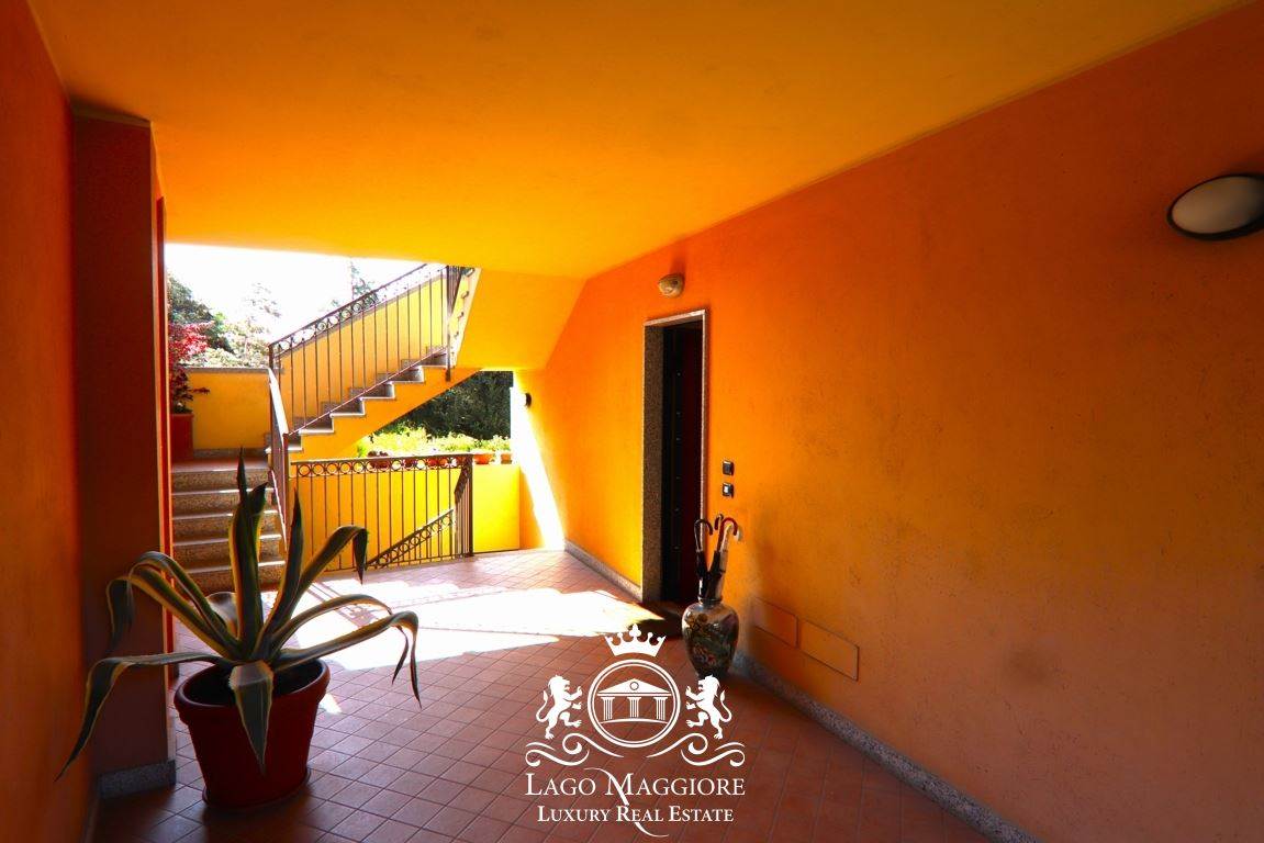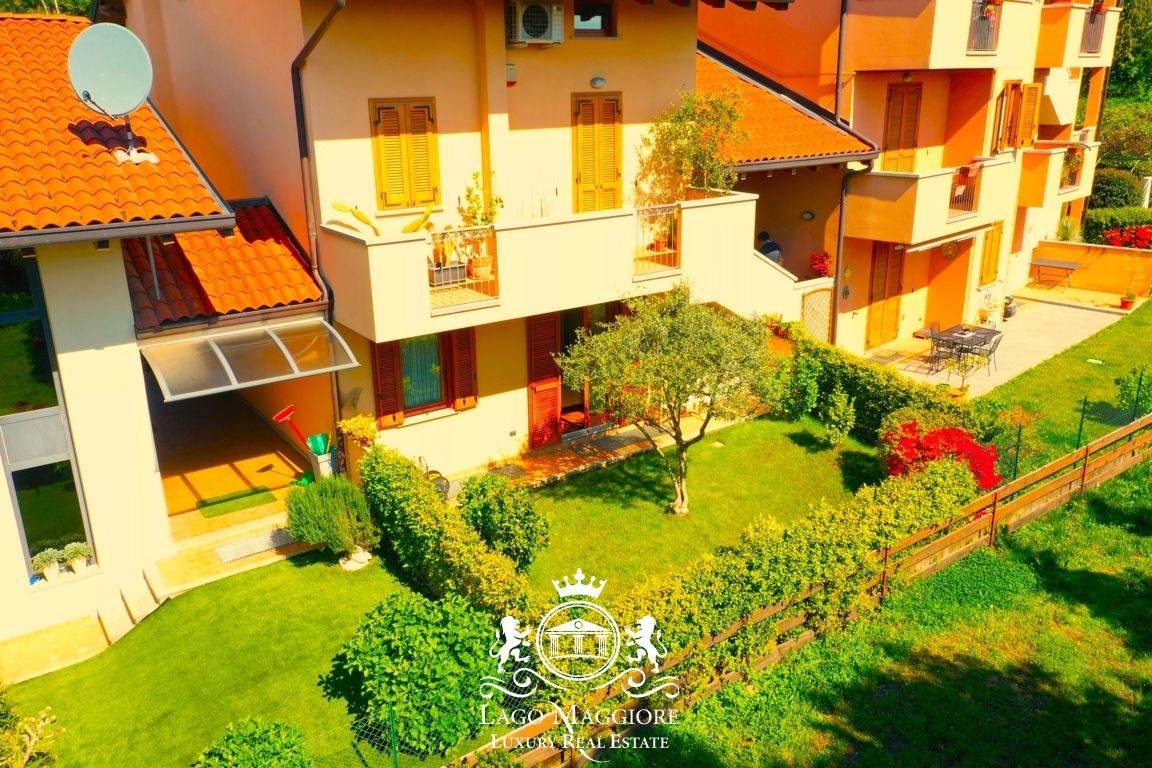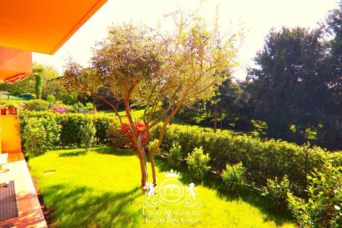 Con mandato in esclusiva proponiamo sulle prime alture di Meina, perla indiscussa del Lago Maggiore, nel pregevole complesso con piscina “Residence Selene”, signorile luminoso appartamento con ampi spazi esterni privati. L’appartamento suddiviso su due livelli ha una superficie totale di circa mq 100 oltre a portici e giardino di circa mq 90. Dall’ingresso principale del complesso residenziale si accede tramite vialetto all’appartamento, un primo cancellino ci conduce in una signorile ampia area esterna piastrellata privata dalla quale si gode di una splendida vista sulla confinante piscina, completa sul retro dell’appartamento una seconda area privata prendisole a prato e piantumata. Internamente al piano terra l’appartamento dispone di un ampio luminoso salone diviso in area divani ed area pranzo con angolo cucina, dal salone si accede alla zona notte, un’ampia camera matrimoniale collegata con il giardino al retro ed un bagno; serviti da scala in legno artigianale si accede al piano inferiore, uno spazioso locale openspace con angolo cucina e bagno, dal locale serviti da porta di sicurezza si accede comodamente al garage.