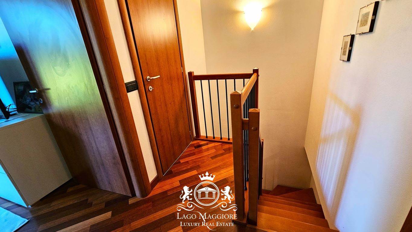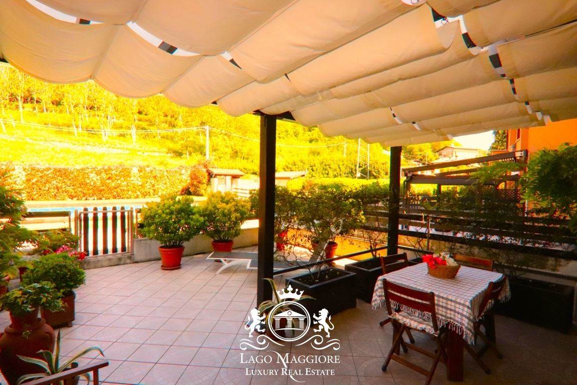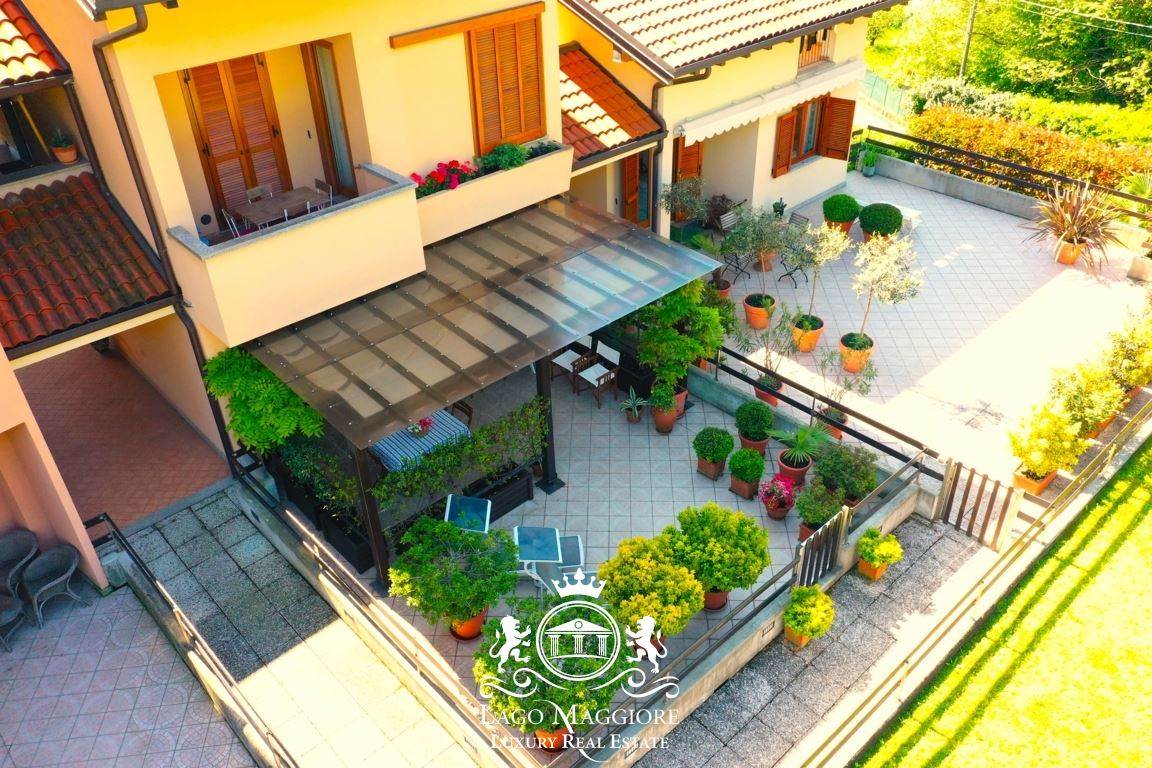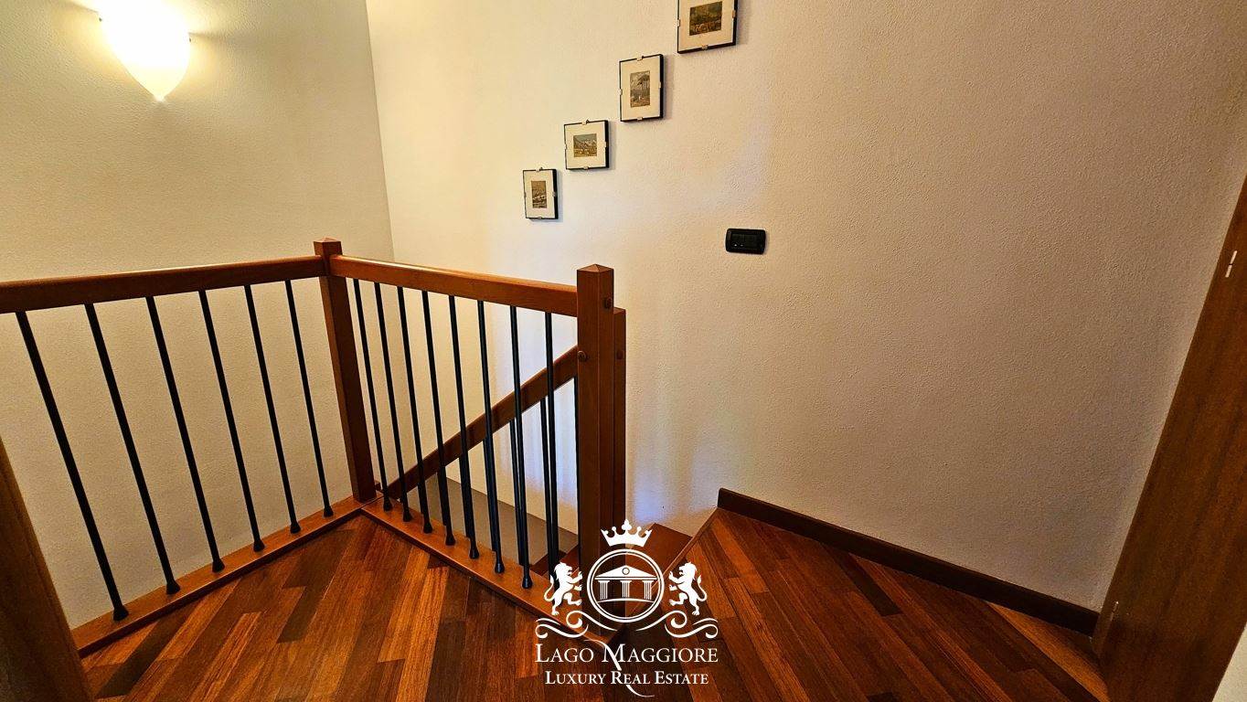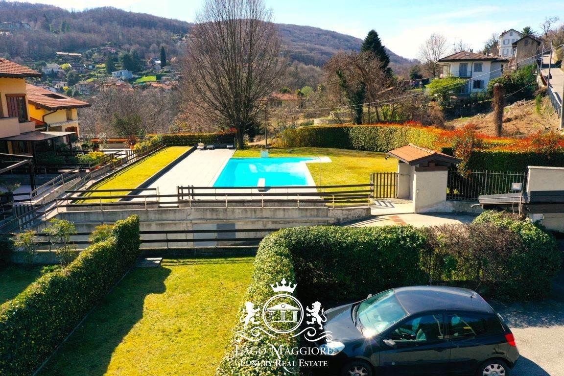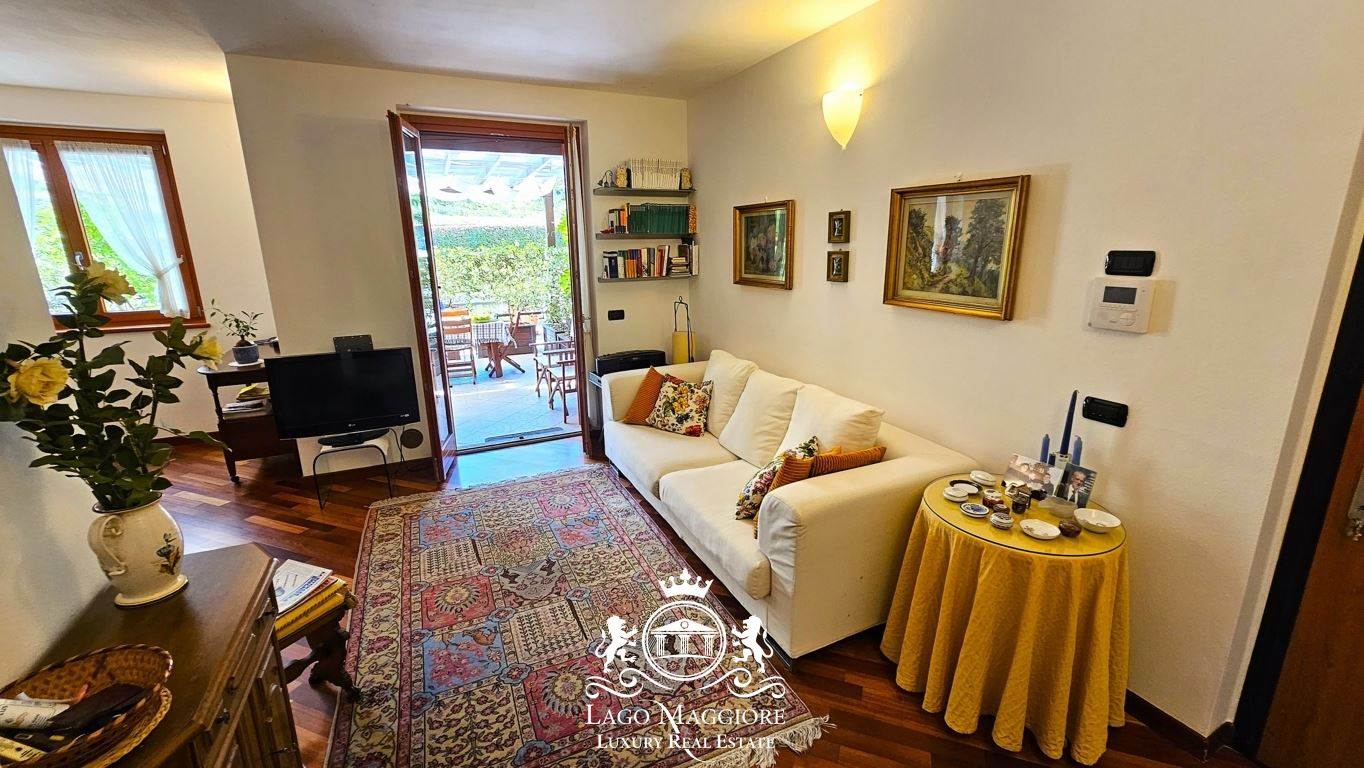 Con mandato in esclusiva proponiamo sulle prime alture di Meina, perla indiscussa del Lago Maggiore, nel pregevole complesso con piscina “Residence Selene”, signorile luminoso appartamento con ampi spazi esterni privati. L’appartamento suddiviso su due livelli ha una superficie totale di circa mq 100 oltre a portici e giardino di circa mq 90. Dall’ingresso principale del complesso residenziale si accede tramite vialetto all’appartamento, un primo cancellino ci conduce in una signorile ampia area esterna piastrellata privata dalla quale si gode di una splendida vista sulla confinante piscina, completa sul retro dell’appartamento una seconda area privata prendisole a prato e piantumata. Internamente al piano terra l’appartamento dispone di un ampio luminoso salone diviso in area divani ed area pranzo con angolo cucina, dal salone si accede alla zona notte, un’ampia camera matrimoniale collegata con il giardino al retro ed un bagno; serviti da scala in legno artigianale si accede al piano inferiore, uno spazioso locale openspace con angolo cucina e bagno, dal locale serviti da porta di sicurezza si accede comodamente al garage.